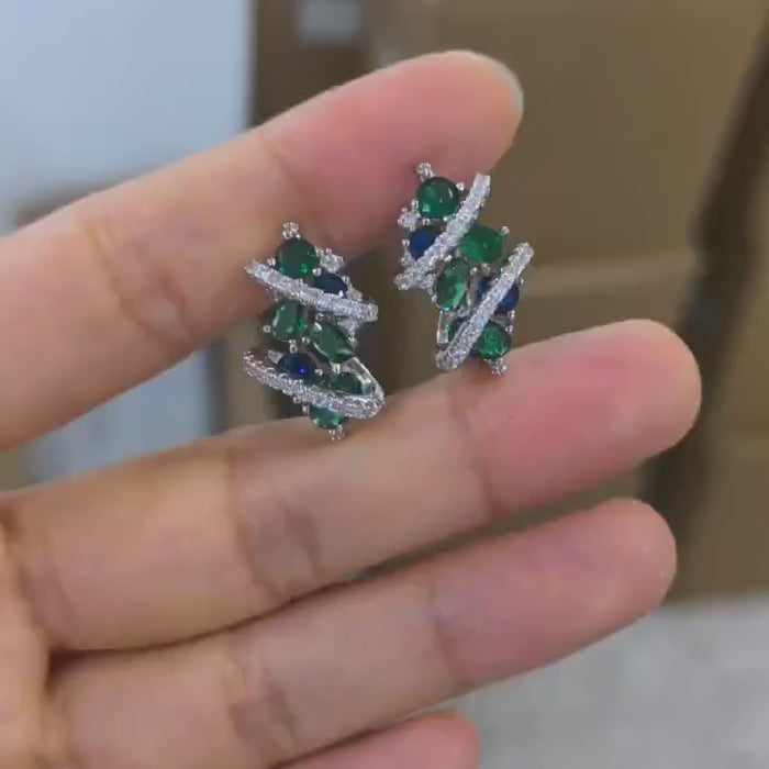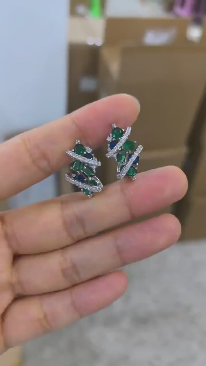 • Stunning cubic zirconia stones with brilliant sparkle and exceptional clarity, perfect for elevating any party ensemble • Geometric design featuring modern cubic shapes that catch light beautifully in blue and green hues • Premium silver plating provides a lustrous finish that resists tarnishing and maintains its shine • Lightweight hoop construction ensures comfortable all-day wear without ear fatigue • Versatile style transitions seamlessly from casual gatherings to formal occasions • High-quality CZ stones offer diamond-like brilliance at an accessible price point • Expertly crafted for women seeking sophisticated jewelry that combines contemporary aesthetics with timeless elegance